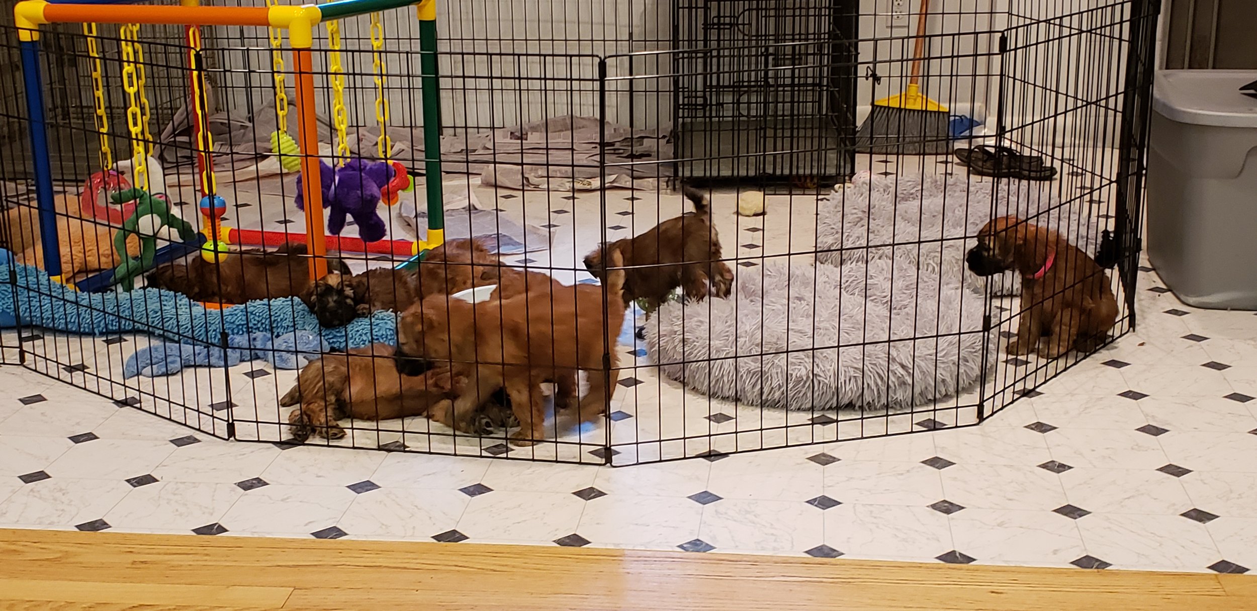 All about changes! The puppies sleeping area changed, with the addition of an ex-pen to their box…they were trying to be clean by using the papers but there just wasn’t enough room. Then they got to move to their daytime space in the main living area…toys, beds, adult dogs, household sounds. They immediately took it all in stride!